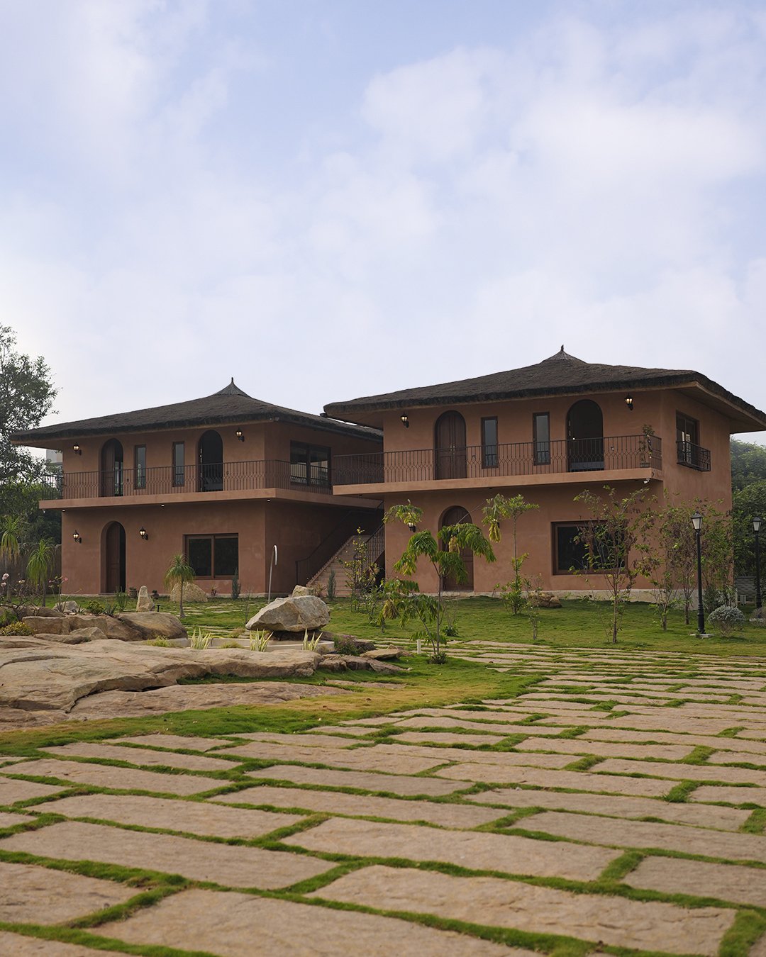 Dhāre features three signature spaces designed to host gatherings of different scales. The Indoor Hall accommodates approximately 500–600 guests and offers a luminous setting framed by elegant French doors. Sangam, the open lawn anchored by a sculpted pergola rising from ancient rock, can host 800–1000 guests for larger celebrations under the sky. The villas feature 2 suite rooms and 4 deluxe rooms, providing comfortable spaces for the bride, groom, and their families. Additionally, 15 more rooms are available to accommodate your guests, ensuring a pleasant and convenient stay for everyone.